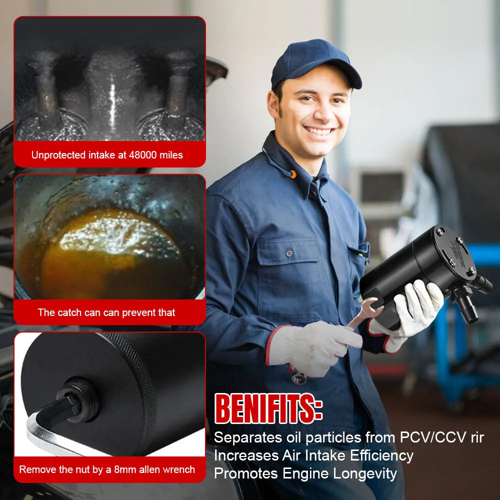 - Separación eficiente de aceite: el recipiente único está montado en línea con el sistema PCV y cuenta con un filtro de bronce de 50 micrones, que separa eficazmente el aceite del aire para proteger su motor.
