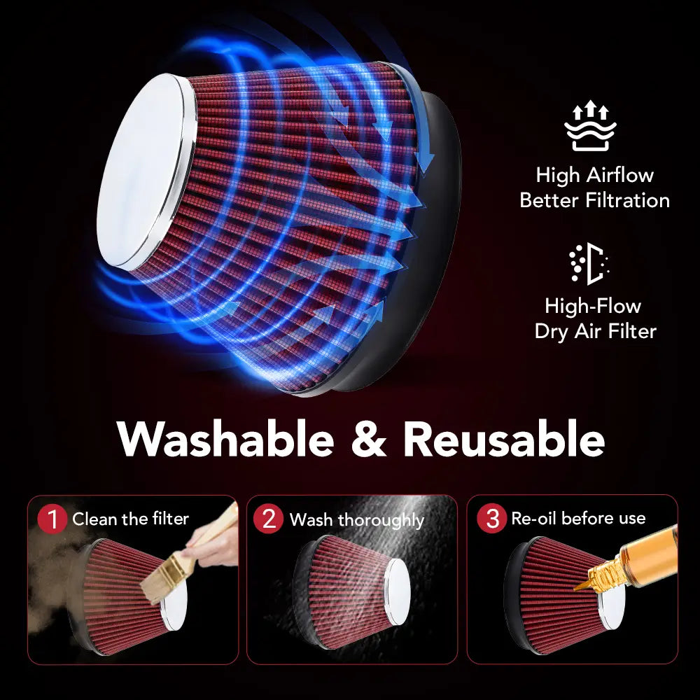 Air Filter: High-Flow Dry Cotton (washable & reusable) No oil required ā zero mess