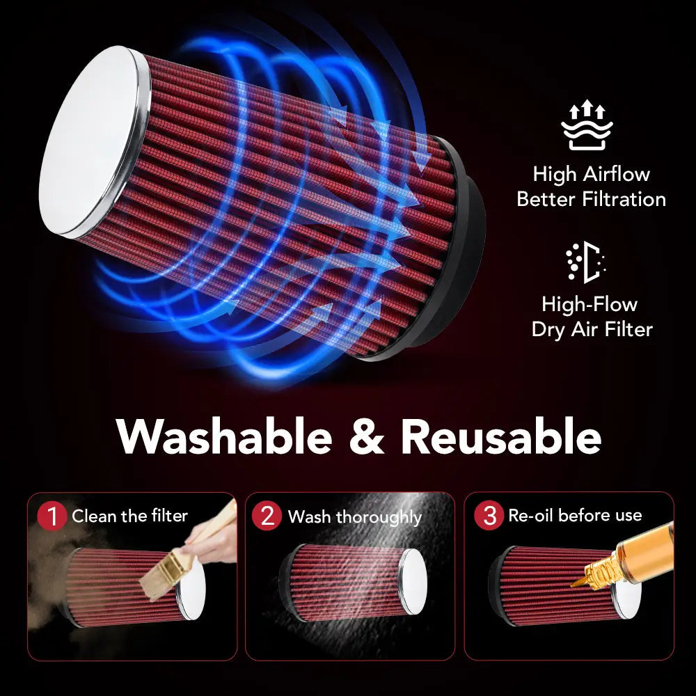 Air Filter: High-Flow Dry Cotton (washable & reusable) No oil required — zero mess