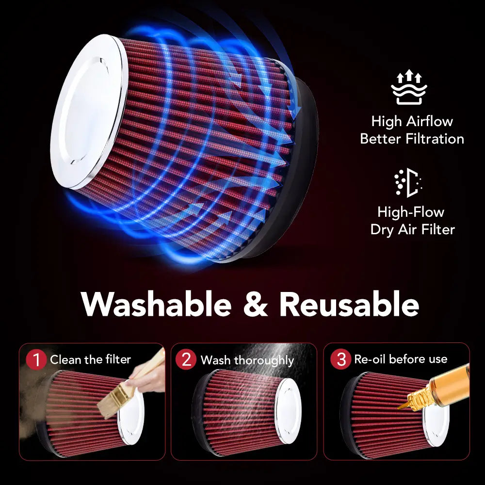 Air Filter: High-Flow Dry Cotton (washable & reusable) No oil required â zero mess