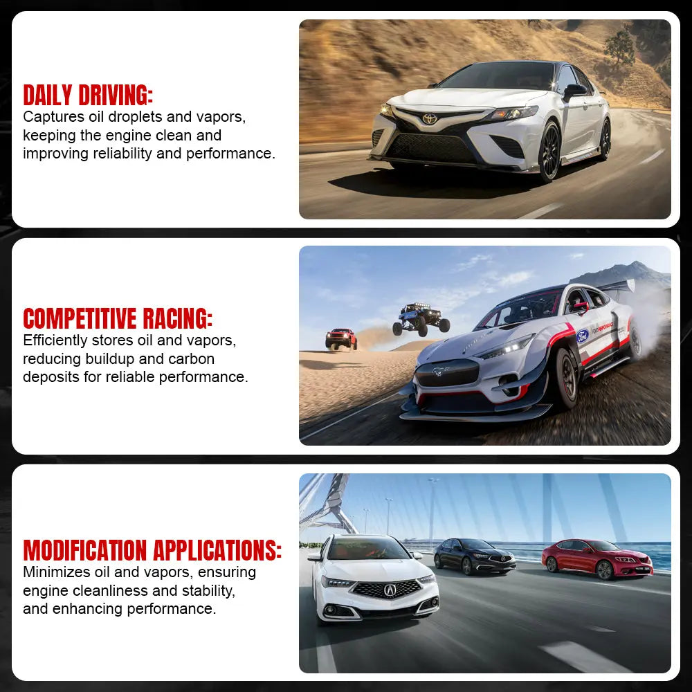 Carbon Buildup Prevention: Oil catch cans capture oil vapors and contaminants before they reach the intake, preventing carbon deposits on valves and maintaining engine efficiency.